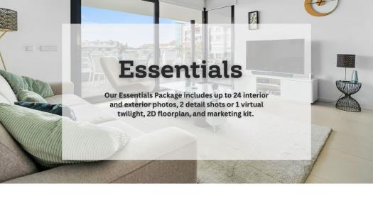 Our Essentials Package includes up to 24 interior and exterior photos, 2 detail shots or 1 virtual twilight, 2D floorplan, and marketing kit.