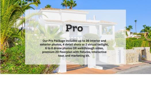 Our Pro Package includes up to 36 photos, 4 detail shots or 2 virtual twilights, 6 to 8 drone photos OR a walkthrough video, premium 2D floorplan, interactive tour, and marketing kit.